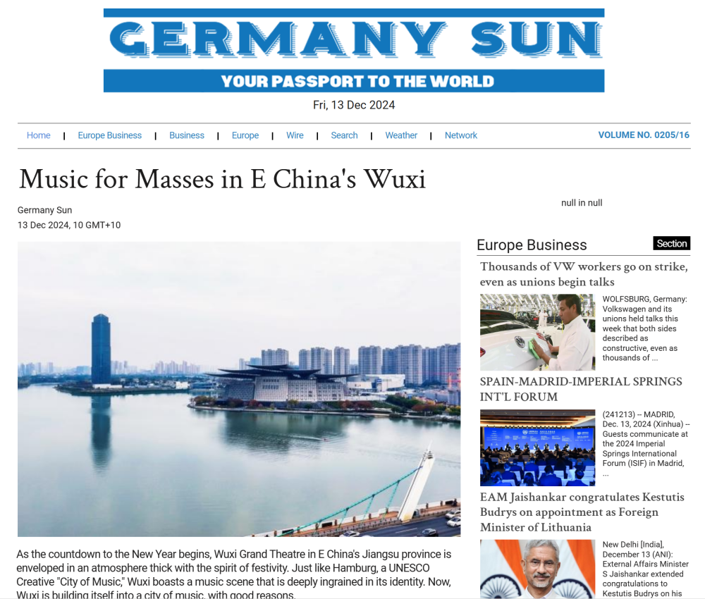 德国太阳报发布文章《在无锡,音乐无处不在(Music for Masses in E China's Wuxi)》,以联合国创意城市网络“世界音乐之都”德国汉堡为例,介绍“东方音乐之城”无锡,音乐场景已经融入城市基因。无锡大剧院作为文化地标,全年演出不断,最低票价80元。文章称,无锡重视音乐艺术人才培养,江南媒体艺术学院采用“院团合一、学演结合”教学模式,彰显“实践即教学、舞台即课堂”的办学特色。音乐之城的美妙“和弦”,不仅奏响在艺术场馆,也渗透到城市中的更多角落。渤公岛湖心乌托邦等文化空间,成为了音乐与艺术的聚集地,为无锡增添了无限活力。