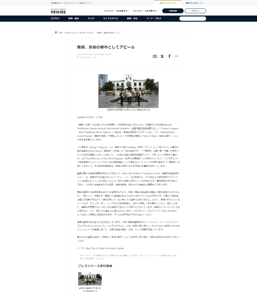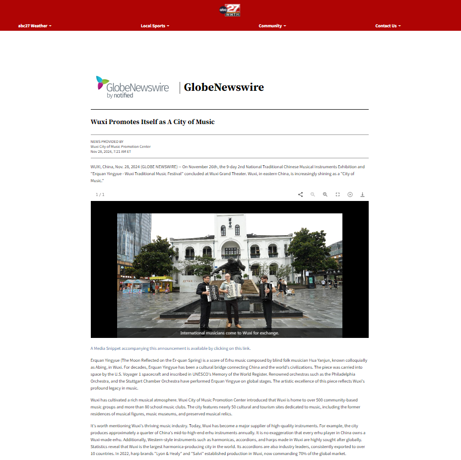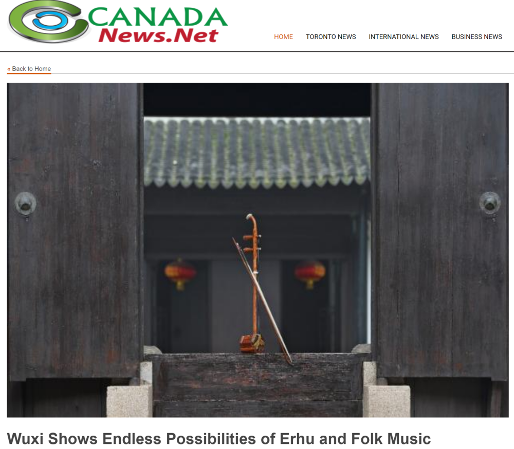 12月12日,加拿大新闻网发布文章《无锡展现二胡与民乐的无限可能(Wuxi Shows Endless Possibilities of Erhu and Folk Music)》,讲述无锡将保护音乐传统与现代创新相结合,迸发出无限可能。文章首先提到了挪威DJ和电音制作人Alan Walker在上海的演出,电音节拍与二胡等民族乐器的交融产生巨大的文化冲击。临近上海的城市无锡,被称为“二胡之乡”和“中国民乐之乡”。阿炳的《二泉映月》从这里诞生,展现出无锡在中国民乐领域的深厚底蕴,刘天华对二胡的改良,发展、丰富了二胡的表现力。文章还提到无锡不仅拥抱传统音乐,也接纳当代音乐,如在无锡影视基地的宋皇宫举办的融合中西音乐元素的新年音乐会,以及在梅村二胡工业园直播间用二胡演奏古典和流行音乐。文章强调无锡正在重新定义“音乐之城”,在保持艺术传承的同时,与现代观众产生共鸣。