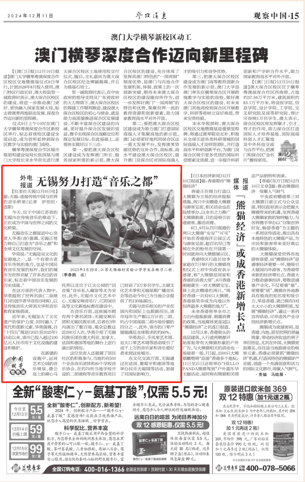12月11日,《参考消息》编译外电报道《无锡努力打造“音乐之都”》。文章说,拉美社12月9日报道无锡市在传统音乐的推动下,正在成为中国与世界之间的文化桥梁。无锡音乐之都促进中心负责人华英(音)强调,无锡正努力将自己打造为“音乐之都”和全球文化发展的空间。无锡不仅加大了文化遗产保护力度,同时融入现代和创新元素,还投资建设文化设施,拥有无锡交响乐团和无锡民族乐团两个著名音乐团体,并在国内外进行演出。报道称,无锡与音乐相关的产业在国内和国际上也脱颖而出。无锡二胡年产量约占中国高端二胡市场份额的四分之一,口琴产量能满足全球需求的约60%。在文化交流方面,无锡通过在法国、葡萄牙和德国等地举办民乐无锡周等活动,加强了其国际影响力。